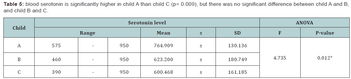 In our study, Sr. serotonin was significantly higher in Child A cirrhotic patients than child C (p< 0.005) and also with statistical significant difference between HCC group and cirrhotic patients. We found serum serotonin is also correlated with liver synthetic capacity, child score, sr. bilirubin and prothrombin time. Abdo – Elmoety et al. [23] found in the cirrhotic group that ROC for AFP at cut off 10 ng /ml the area under ROC curve was 0.733, p=0.074 showing 51.11% sensitivity, 100% PPV and 31.25% NPV and 60 % accuracy .Found also serotonin AUROC with cut off 75ng /ml (0939) p=0.031 showed 86.67% sensitivity and 100% specificity with 62.50 % NPV and 89.09% accuracy. And serotonin in the HCC group at cut off 75ng/ml by ROC the diagnostic performance ARGHived 100%. In the present study sensitivity of serotonin 89.71%and specificity 85%and sensitivity of AFP is 100% and specificity 70%.