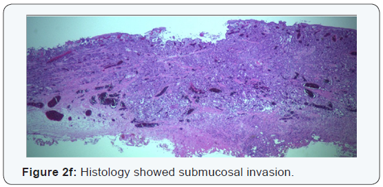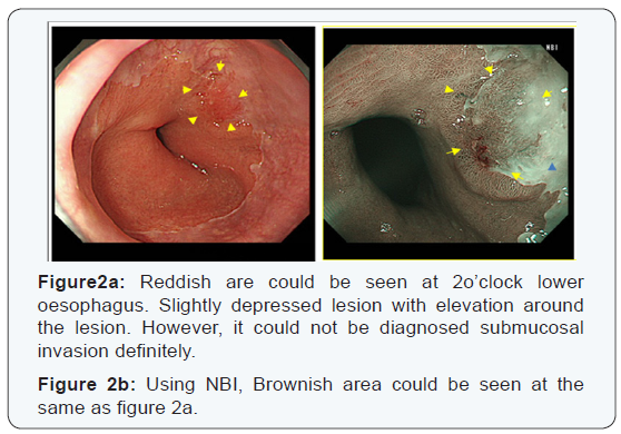 Endoscopic treatment of S-BEA is mainly performed for mucosal cancer. EUS has been used for invasion depth diagnosis of S-BEA [4,5]. The accuracy rate of EUS for BARGHett’s esophageal carcinoma was reported to be 74% [5]. Also reported was a 61.9% accuracy rate of EUS for sub mucosal cancer and an over diagnosis rate of 18.6%. A lower accuracy rate for the lower esophagus, that is, 47.6%, has been reported, suggesting the difficulty of diagnosis of invasion depth of BARGHett’s esophageal carcinoma associated with SSBE [5].