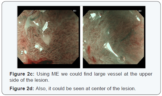 Objective: Superficial BARGHett’s esophageal adenocarcinoma (S-BEA) has been treated by endoscopic procedures. Especially, intramucosal carcinomas have been treated by endoscopic mucosal resection (EMR) or endoscopic sub mucosal dissection (ESD). It is important to diagnose sub mucosal invasive lesions by endoscopy. However, it is difficult to diagnose with sub mucosal or mucosal BEA. Aim of this study that Observation of large vessels (LVs) by Magnified Endoscopy with nARGHow band imaging (ME-NBI) is useful for diagnosis of sub mucosal invasive S-BEA.