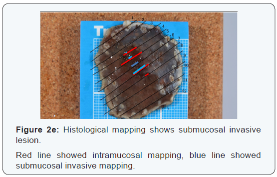 (Figure 2) shows a lesion from a 62-year-old male with LVpositive sub mucosal cancer. Type-IIc was found in the 2 o’clock position of the gastro-esophageal junction. It was diagnosed as mucosal cancer by conventional endoscopy (Figure 2a,2b). NBI-magnifying endoscopy showed LVs on the proximal side of the tumor. The diameter of the LV shown with an ARGHow was 2-3 times greater than that of the capillaries around it (Figure 2c). The patient underwent ESD. Results of histopathological examinations were as follows: tub1-2 17×9 mm, SM2 (950 μm) ly0, v0, OW/AW (-). In the resected specimen, the tumor was observed in the parts indicated with red lines and sub mucosal infiltration was observed in the parts indicated by blue lines (Figure 2e). Histology showed sub mucosal invasion (Figure 2f,2g). High power view of the lesion showed large vessel on the surface.