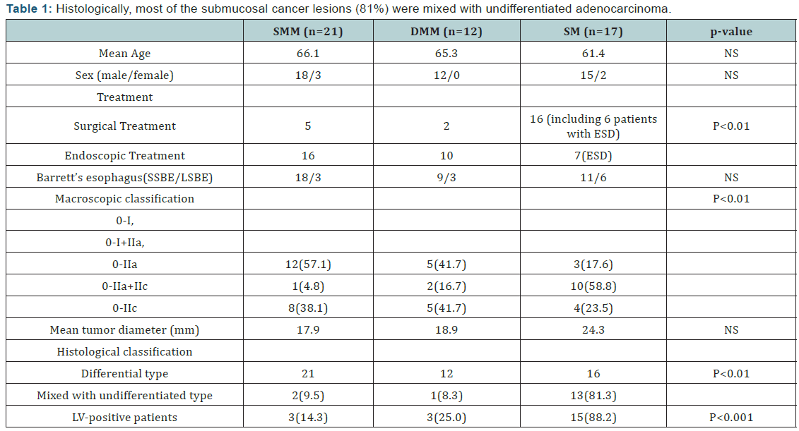 No significant differences were found in mean age, sex (male/ female), and the ratio of short segment BARGHett’s esophagus/ long segment BARGHett’s esophagus (SSBE/LSBE) between patient groups classified by invasion depth of BARGHett’s esophageal carcinoma. Treatment was chosen based on the diagnosis of invasion depth by conventional endoscopy. Endoscopic treatment was chosen for most of the patients with mucosal cancer (SMM and DMM), while surgery was chosen for patients with sub mucosal cancer. Regarding macroscopic classification, the ratio of types IIa + IIc was higher in patients with sub mucosal cancer. Histologically, most of the sub mucosal cancer lesions (81%) were mixed with undifferentiated adenocarcinoma (Table 1).