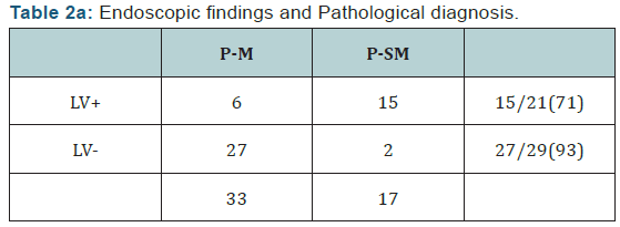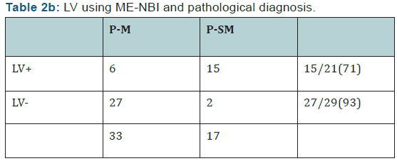 (Table 2) shows a comparison of results of invasion depth diagnosis by conventional endoscopy and by LV imaging. The overall accuracy rate of conventional endoscopy was 72% (36/50); in patients with mucosal cancer it was 78% (26/33) and in those with sub mucosal cancer it was 59% (10/17). On the basis of LV-positive and LV-negative findings the overall accuracy rate was84% (42/50); in patients with mucosal cancer it was 82% (27/33) and in patients with sub mucosal cancer it was 88% (15/17). The accuracy rate was significantly higher for diagnosis with LV-positive/negative findings than with conventional endoscopy (Table 2). Accuracy rate, Sensitivity, specificity, PPV, NPV showed (Table 3).