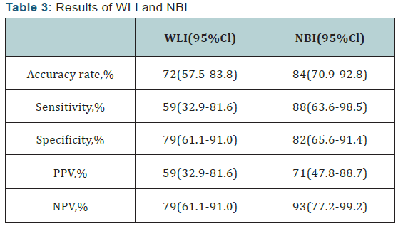 Results: Using WLI, the accurate diagnostic rate (AR) was 72%, sensitivity was 59%, specificity was79%, positive predictive value (PPV) was 59%, and negative predictive value was (NPV) 79%. With ME-NBI, the AR was 84%, sensitivity was 88%, specificity was 82%, PPV was 71%, and NPV 93%.