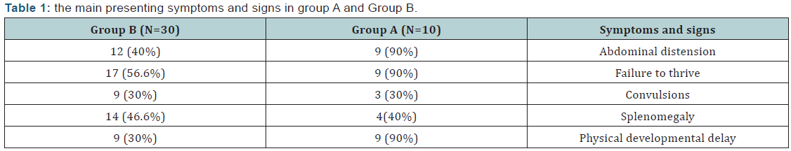 Based on clinical, biochemical and histopathological findings 10 children proved to have GSD-I in this study. They were 5 males & 5 females with no statistically significant difference regarding sex. In agreement with these findings, previous studies [12,13] reported that the sex ratio among the studied GSD-I patients was 1:1. Regarding the clinical presentation in the present study, abdominal distension, failure to thrive and physical developmental delay were present in 90% of GSD-I patients, convulsions were present in 30% of them and hepatomegaly was present in all GSD-I patients (100%). This is in accordance with previous studies [13-16] who reported that the main complaint in GSD-1 patients was abdominal protruding with different rate from 57.8%- 83.3% of cases, followed by growth retardation in 40%- 50% of cases and hepatomegaly was present in 100% of cases. The main laboratory findings of GSD-I patients involved in this study, fasting hypoglycaemia and anemia, have the highest frequency (100%), followed hyperlipidemia (80%) followed by hyperuricemia (70%), while hyperbilirubinemia has the lowest frequency (30%). In agreement with these findings, previous studies [14,16,17] reported that hypoglycemia, hypertriglyceridemia, lactic acidosis, hyperuricemia were the most frequent laboratory findings among GSD-I patients. Also Carvalho et al. [18] found that all patients with GSD-1 in their study had anemia.