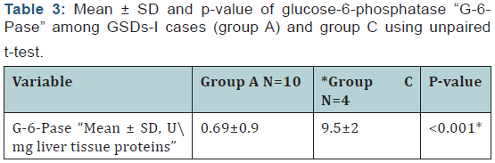 (Table 3) shows comparison between of glucose-6- phosphatase “G-6-Pase” among GSDs-I cases (group A) and control group.