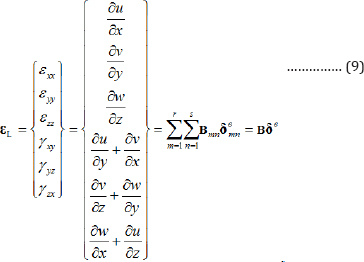 where, Bmn is a 6 x 9 matrix and is called the strain matrix mn of the (m, n)th term. This matrix is obtained by proper derivation of u, v and w which are defined in terms of shape functions in Equation (3].εNL is also defined as:
