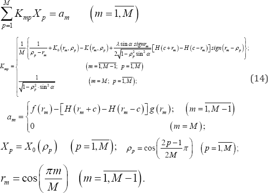 Now, as it was mentioned above, the determinative singular integral equations (S.I.E) (10) can be reduced to a system of linear equations and following to the approach represented in [1], the determinative S.I.E (10) can be reduced to the system of Algebraic linear equations as follows: