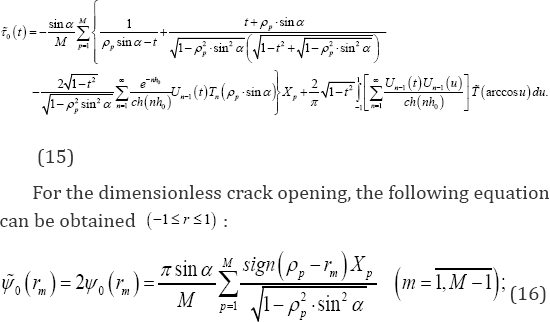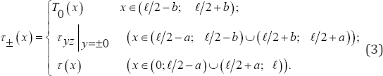 The main physical characteristics of the stated problemcan be expressed by the determination of the system of linear equations (14). The plate shear stress out of the crack at the interval y=0 ,x ∈ (0,𝓁 /2-α)∪(𝓁/2 + α,𝓁) can be obtained as below: