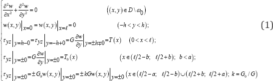 Now, let's derive the governing equations of the stated problem. For this purpose, it must be initially mentioned that the component uz = w (x, y) in the direction Ox-axis is the only non- zero component of displacement in the case of antiplane deformation, and harmonic function in the area D ω0. The components of shear stress τxz and τyz are the only nonzero components of stresses. Therefore, the problem can be mathematically stated as a boundary value problem in the following way: