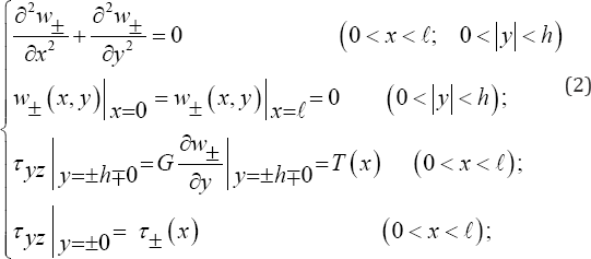 Following the approach represented in [1] consider a prismatic elastic body with a rectangular cross-section in Cartesian coordinates Oxyz occupying an area Ω = {-∞≤x≤∞; -h ≤ y ≤ h; -∞< z <∞} and possessing a shear modulus G . The prismatic elastic body is rigidly clamped by the vertical edge x = -∞ and x = +∞ , and loaded by the shear forces equal to T (x) acting both in positive and in negative directions of Oz -axis at the horizontal y = ±h . Furthermore, on the symmetry plane y = 0 , the body Ω has several through-in-thickness cracks each in a shape of strip with length 2a on plane y = o and -∞< z <∞ at distances equal to 𝓁 (α < 𝓁/2). The shear forces of equal intensities T0 (x) are acting in opposite directions of Oz-axis on the upper (+) and lower (-) areas of edges ω±={y = ±0; 𝓁/2-b < xi < 𝓁/2 + b; -∞< z <∞ } (b <a) of the crack. Besides that at the ending areas