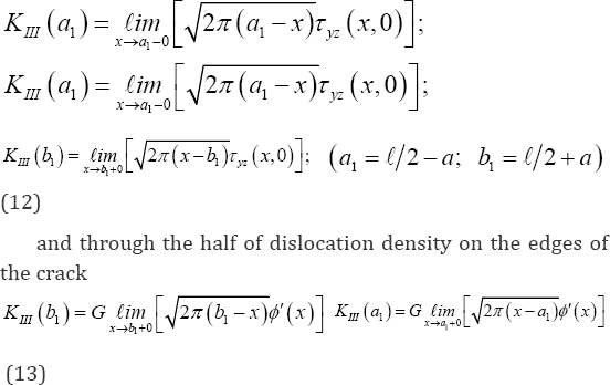 Finally, the stress intensity factors at the end points (a1;b1) of the crack can be expressed by the following equations: