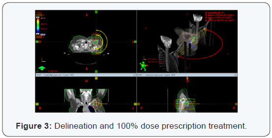 The treatment technique corresponded to volumetrically modulated arc therapy (VMAT) for this, two semi-arches were used. The first from 0° to 179° towards the direction of clockwise (CW) and the second reverse direction arc (179° to 0°). They were established for each arc 98 control points with maximum speed of gantry 4.8 deg / s. Each semi-arch lasted 48 seconds (0.8min) (Figure 3 & 4). The bodies’ risks were considered for planning spinal cord, left lung, left humeral head and left mammary gland. As establishment of an NTO (normal tissue objective) use the automatic option. Resolutions (mm) and priorities (%) planning for OAR (organ at risk) were, respectively: spinal cord 2 mm and 35%, humeral head 2.65 mm and 25%, left lung 3 mm and 30%, left breast 3 mm and 25%.