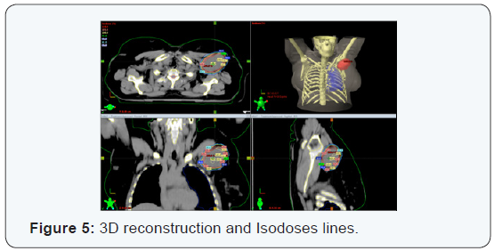 The patient was positioned in supine using a table for breast carbon fiber of the CIVCO® brand. Package tumor localization (TumorLOC®) Brilliance CT was used for the location of tumor tomography simulation. This tool allows you to place the isocenter manually depending on the selected organs and can create orthogonal beams associated with that default position of isocenter. Tomographic scanning technique was 120kV, axial cut, over 200,3 mm apart.