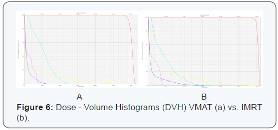 One of the benefits of this proposal lies among other things in the runtime patient treatment compared to some other CRT3D or IMRT technique. The maxim and average doses to OAR were: 27.3 Gy / 10.5 Gy (VMAT) and 36 Gy / 9.12 Gy (IMRT)for left humeral head (green); 60.0 Gy / 5.2 Gy (VMAT) and 60.5 Gy / 5.7 Gy (IMRT) for left breast (yellow); 8.5 Gy / 2.7 Gy (VMAT) and 9.6 Gy / 2.9 Gy (IMRT)for spinal cord(purple) and finally 17.3 Gy / 1.77 Gy (VMAT) and 35.5 Gy / 2.5 Gy (IMRT) for left lung (blue) (Figure 6)