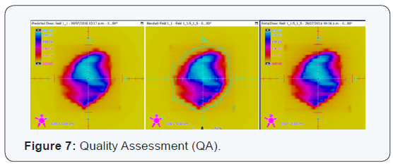The two semi-arches were evaluated for creep refers using an amorphous silicon system to perform dosimetry portal. Descriptors parameters for evaluation were the index gamma 3% and distance agreement (DTA) 3mm. Predicted doses vs. the portals doses obtained successfully passed the evaluation criteria (Figure 7).