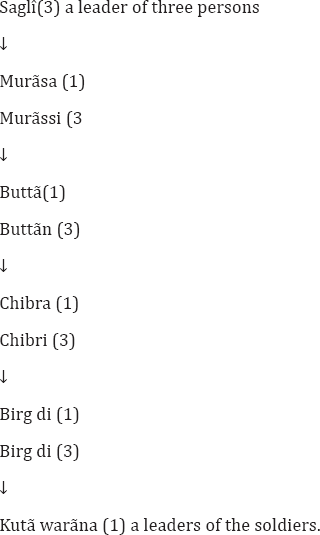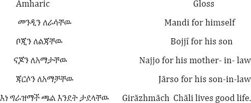 Authority/power started from chika shum upwards to atibiya dãñã, misilane, waradã administrator and awurajjã administrator. These were the power structure at awurajjãlevel. The highest power under awurajjã was waradã administrator and awurajjã administrator. The administrators of both waradã and awurajjã were nominated from among the relatives of Kumsã Moroda. Beyond waradã and awurajjã levels, the relative of Kumsã administered mislane level. Tafari Ejeta Rõrõ was the best example of Siba Misilane administration. Mana-Sibũ waradã was administered by Dãjjãzmach ChãliYadãta, whereas Baranbaras Gamadã Urgesa was Najjo administrator. Tadase Gamadã, Getachew Chãli,UmarAlkãdir, Azãchaw ch rinat, qaññazmãch Disãsa Karo were the administrators of Jãrsõ, Bõjji Chokorsa, Yubdo, Hãru and Nõle Kãbbã respectively. The GimbÎ town administrators were Bãllã Mollã, Adane and Dajjãzmãch Gabre Tsadiq. The above waradã administrative were Kumsã Moroda's relatives. So that, the minstrel said that