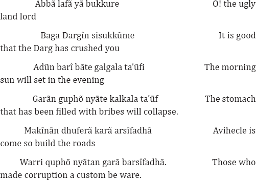 The government ordered 20 gasha of land should constitute a kabale. Land was given to the majority (farmers). As Ato Tafara Bultum informed to me that he could not get access to land during Emperor Hailesillassie. He rented plots of land from seven persons. He gave half of the produce to the land lord. When the policy of "land to the tiller" [5] was announced Ato Tafara Bultum was entitled to take all the seven plots of land he had rented. Moreover, the cattle he used to look after was confiscated by him. To explain this situation the community forwarded the following poem: