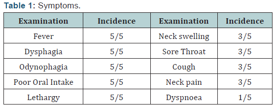 A total number of five cases have been taken in the present study treated in the past three years, The age group of the patients ranged from 3yrs to 10 yrs, (mean age was 5.2 yrs). Majority of the patients (60%) were males and from poor socioeconomic status. The chief complaints of the patients present in all the cases were (Table 1) Fever, Dysphagia, Odynophagia, Poor oral intake and lethargy which was present in 5/5=100% cases. Patients also complained of cough with sore throat and neck pain with neck swelling and stiffness (3/5=60%) Dyspnoea was present in (1/5=20%) cases.