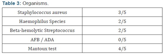 The findings on examination were (Table 2) - Irritability with fever and retropharyngeal bulge were found in all the patients (5/5=100%). 3/5 i.e. 60% patients had lethargy, nuchal rigidity and, drooling of saliva, trismus. Two patients (2/5=40%) has extension of the abscess in the neck presenting as neck swellings. Stridor was found in only one (1/5=20%) patient and no patient had respiratory distress or cervical adenopathy.