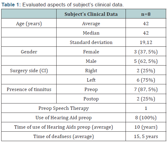 The hybrid cochlear implants were performed in 8 patients in these periods. The evaluated aspects are described in (Table 1). In (Figure 1) can be seen the average of pure tone thresholds in the preoperative, postoperative and after activation of the cochlear implant (CI).