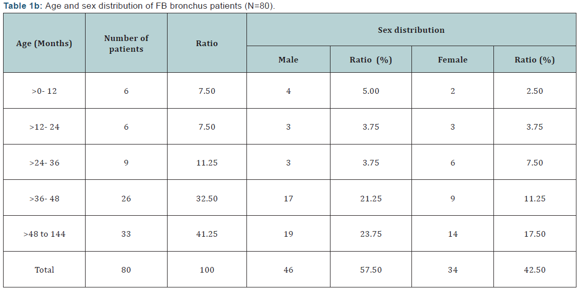 patients, the youngest age was three months & eldest age was 12 years and the incidence was more in males than in females. Among air way foreign bodies, the minimum age was three months and maximum was 11years and males were more than female with 46:34 (Male: Female) ratio in the total of 80 patients. The demography and patient profile are tabulated below (Tables 1a & 1b).