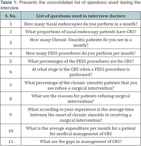 Methods: In order to gather information from a diverse group of Ear Nose Throat (ENT) specialists from different parts of the country, a strategy to collect information at a national level ENT conference was adopted. At Gurgaon, Haryana, ENT specialists were selected at random and those who had more than 5 years of clinical experience and see an average of 15 or more CRS cases per month were selected for a detailed interview.