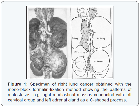 Field of performance of the postmortem examination was improved upon personally when, in 1963, I instituted in Glasgow, Scotland the mono-block formalin-fixation method for investigating lung cancer [3]. (Figure 1) It was this particular method that enabled me to obtain the long 45 cm thoracic duct in its entirety. Furthermore, on account of serendipity, I made use of the Swiss-roll method of coiling the duct in order to study it on one microscope slide [2]. Hitherto, as Udah found out [4], it was tedious to employ cross sections.