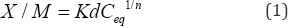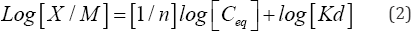 where X/M is the quantity of PO4'3 sorbed per unit mass of sediment (mg/kg), Ceq is the equilibrium concentration of PO4'3 in the solution (mg/L) and where Kd and n are the constants. The logarithmic form of the Freundlich equation to plot the data is shown in Equation (2):