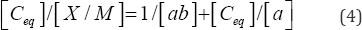 [Ceq]/[X/M] can be plotted as a function of Ceq. The linear regression of the data points yields a best-fit line with a slope of 1/a and 1/ab as the intercept. The maximum amount of PO4'3 that can be sorbed onto the samples can be calculated from the Langmuir linear equation.
