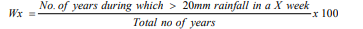 The five years daily rainfall data was converted into weekly basis. Average weekly rainfall, average weekly rainy days and probability of wet spells and dry spells were calculated based on standard criteria's and are presented in below Weibull's formula was used to calculate the probability distribution.