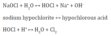 hypochlorous acid + acid (from vinegar, toilet bowl cleaners etc.) ↔ water + chlorine gas