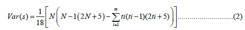 The variance of S, for the situation where there may be ties (i.e., equal values) in the x values, is given by as: