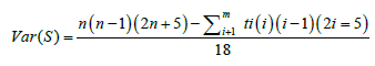 It has been documented that when n ≥ 8, the statistic S is approximately normally distributed with the mean. E(S) = 0 The variance statistic is given as
