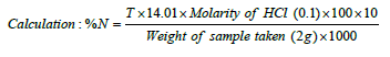 Nitrogen content of the sample was determined by using Kjedahl technique [14]. The method involves digestion of samples, distillation of digests and titration of distillate.
