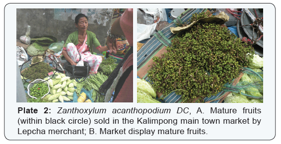 Wild edible fruits are the important source of dietary supplement for local inhabitants of certain geographical region of the country. The tribal population are eagerly engaged to eat such wild fruits and vegetable items for their survival. Similarly, Zanthoxylum acanthopodium DC. is such a fruit which cannot be eaten more than one or two number of fruits at a time by a person. It has typical fragrance which comes after crushing fruits which is liked by the locals. People of the region mainly ethnic groups like Lepcha, Sherpa, Bhutia, Tamang, Limbu or Subba, Rai, Thapa or Manger, Newar or Pradhan, Bhujel or Khawas, Sunuwar or Mukhia, Chettri, Bahun or Sharma, Kami, Damai, Sherki are very much familiar with this fruits and frequently used in case of gastritis and in the form of pickle both raw and preserved. Once fruit is craushed inside mouth using teeth causes breethlessness leading to death of the eater. However, any person suffering by breathlessness after causing Zanthoxylum acanthopodium DC. fruits is given a pinch of fine soil, he quickly recovers. In fact eating of soil is the only immediate solution to this problem (mother’s instruction to the last author during childwood which they practically experimented among brothers during their childhood taking fruit). Fruits are sold in the markets of Kalimpong (Plate 2: A&B), Darjeeling and Kurseong in the month of June -August.