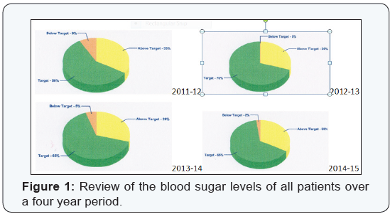This showed that over a four year period 65% of those tested had a blood sugar within the normal range with 4% being below target and 31% being above the target range. It is interesting to note that in the first year 24 blood glucose levels were measured of which 58% were in target:; in the 2nd year 27 of which 70% were in target, in the 3rd year 55 of which 65% were in target and in the last year 88 of which again 65% were in target. There has been a marked increase in the numbers of diabetics in the general population, most probably due to the increase in obesity and this appears to be mirrored in the custodial population especially over the last two years when in year three it doubled and then when it increased again by 60 % in year four. However the percentage of in target blood levels did not increase and in fact, pro rata, has therefore decreased in the last year.