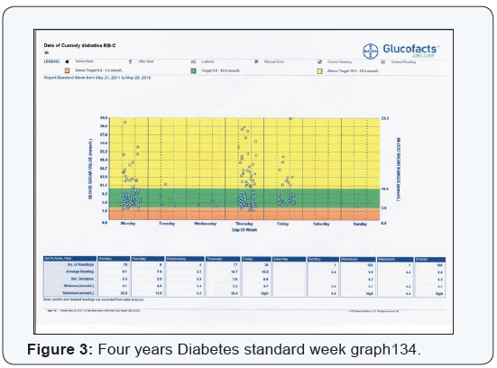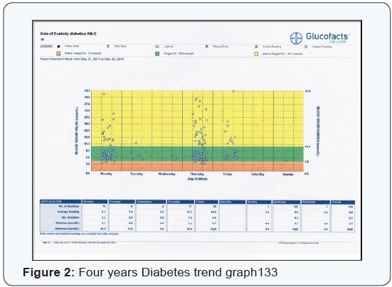 Although admittedly anecdotal, it is a well accepted premise, that prisoners in any form of custodial situation and when in a medical consultation with a doctor or nurse, may well declare illnesses that do not exist, exaggerate those that do or allege symptoms and conditions that are false, along with a past medical history that is both confused and/or deliberately untrue. There has been a number of papers published dealing with the medical and mental assessment of police detainees, their clinical care and medication [2-4]. It is then a regrettable fact that doctors working with such patients in a custodial milieu should be very cautious about accepting patient information given by detainees at face value. Information and awareness about diabetes is increasing in the general population and subsequent GP visits, as mentioned earlier, have resulted in the recent rise in the diagnosis of all types of this illness in the UK. Conversely it is often misperceived, and thus sometimes falsely declared by prisoners, as a dangerous illness, which, if handled sensibly, it is not. If diabetes is declared the doctor should always suggest that the patient consent to a base line capillary blood sugar level at the initial consultation and again subsequently to show a pattern or of if treatment is clinically indicated. Any suggestion of treatment with tablets or insulin without doing a blood sugar is clearly negligent either way. In such circumstances the use of a medical template as an aide-memoire is often very helpful [5]. The usual clinical targets for diabetics is to aim for the range of a non-diabetic. These are blood sugar levels two hours after food of 3.9 – 8.0 mmol/L and levels before food of 3.5 – 5.5 mmol/L. However, used here as a rule of thumb in custodial situations, a “normal” range of 4.0 mmol/L to 10.0 mmol/L has been applied for those fit to detain.