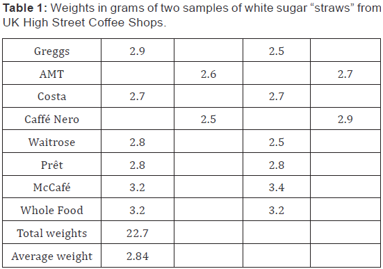 The two samples of white sugar from each source were weighed unopened on a set of Fuzion FZ-350 electronic scales [6] bought by the author from the somewhat bemused owner of the local “bong-shop” or “head shop” in Brixton, where drugs paraphernalia are sold. The average weight for all the sample sachets of white sugar was 2.84 grams with Costa, Whole Foods and Prêt having the best regularity in weight. Perhaps it is also now high time for any suppliers of these sugar portions to give the weight in grams on the packaging? This should also be the case for all Airline sugar packs, so that when the tannoy call goes out for a physician to assist during an in-flight medical crisis, he or she is aware of the amounts and can calculate accordingly for treating a diabetic hypoglycaemia. On a recent Swissair flight the author was provided with both straws (5.2gm and 5.0gm) and sachets (4.4gm and 4.5gm); the respective weights being ascertained on returning home.