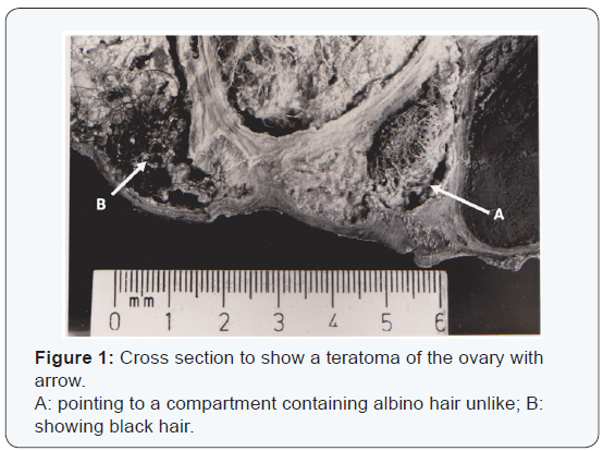 Ovarian teratoma is illustrative of the special form of growth which exhibits the bodily three-germ cell elements [1,2]. Likewise, there are several variations on the theme, including those written by the senior author (WO). Thus, beginning in 1976 [3], others appeared as recently as 2015 [4-6]. Therefore, this joint Case Report concerns differently colored hair compartments in a teratoma in Nigeria.