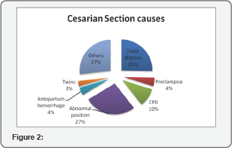 The following diagram illustrates the reasons for caesarean section for those who gave birth this way, where it's found that 27% of those who have it suffered from abnormal fetal position, and 25% the reason was fetal distress, and 10% due to CPD, and 4% due Antepartum hemorrhage, and 4% also due to Preeclampsia, and 3% due to carrying twins, and 27% for other reasons.