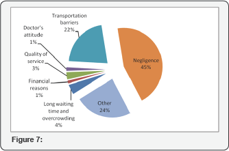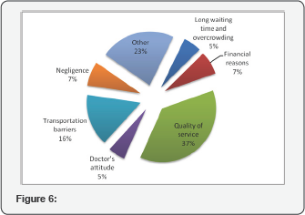 And when asked about the reason that some of the woman changed the first place of their pregnancy follow-ups they answered as follow, 37% of them changed the place because of the quality of services provided, and 16% changed it because of lack of transportation, and 7% for financial reasons and 7% due to negligence, and 5% because of the long wait times and congestion, and 5% due to the attitude of the physician, and 35% change the place up for other reasons (Table 9 & Figure 5).