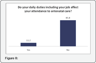 The following figure shows the distribution of participants according to whether daily work duties affect their presence to the pregnancy follow-ups, and answered 85.8% said that work duties do not have an impact on the visits, while 11.2% of women answered that daily duties and work have an impact on their attendance to pregnancy follow-up (Table 11).