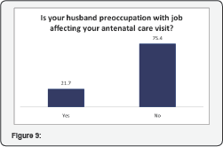 The following figure shows the distribution of participants by whether the busyness of their husbands affect one way or another their attendance to prenatal care, and answered 75.4% of women are not affected by it, while 21.7% of women is affected by it (Figure 7).