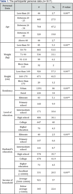 The population was all pregnant women mainly from Madina region in Saudi Arabia during August and September 2016, a random sample of (1617) woman was selected, and Table 1 shows their properties according to their personal information: