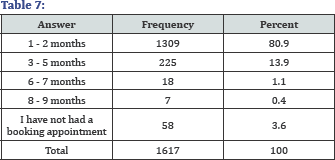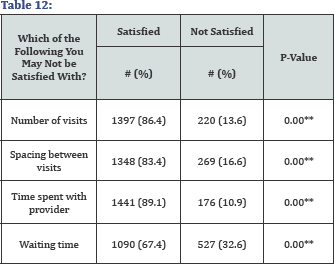 The following table shows some of the things that women may not be satisfied with during the follow-up of pregnancy, 86.4% of women are not happy about the number of visits, and for the time between visits found that 83.4% of women are unhappy with it, but for the time being spend with your physician there were 89.1% of women are not satisfied, and for the waiting times it was found that 67.4% of women are not satisfied (Table 13)