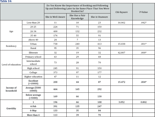 The second hypothesis states that there is a relation between the knowledge of the importance of booking and following up and delivering later in the same place, and each of (Age, Residency, Level of education, Income of household, and Gravidity): Using the Chi-Square test was tested the NULL hypothesis which states that there is no relation between the knowledge of the importance of booking and following up and delivering later in the same place, and each of (Age, Residency, Level of education, Income of household, and Gravidity), versus the alternative hypothesis which states that there is a relation between the knowledge of the importance of booking and following up and delivering later in the same place, and each of (Age, Residency, Level of education, Income of household, and Gravidity), the next table shows the test results (Table 15).