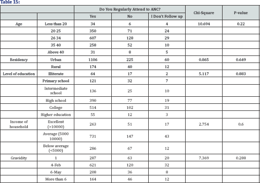 The third hypothesis states that there is a relation between the regularly attendance to ANC, and each of (Age, Residency, Level of education, income of household, and Gravidity): Using the Chi-Square test was tested the NULL hypothesis which states that there is no relation between the regularly attendance to ANC, and each of (Age, Residency, Level of education, Income of household, and Gravidity),versus the alternative hypothesis which states that there is a relation between the regularly attendance to ANC, and each of (Age, Residency, Level of education, Income of household, and Gravidity), the next table shows the test results (Table 16 & Figure 10).