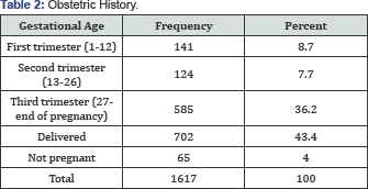 The following table shows the participants' distribution according to their Gestational age; 36.2% of them were in the third trimester, while 8.7% of them were in the first trimester, 7.7% of them were in the second trimester, 43.4% of them had given birth to their babies, and only 4% of them weren't pregnant (Figure 1).