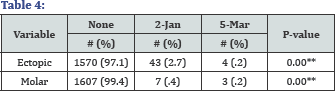 The next table shows the women participants' distribution according to whether they ever had abnormal pregnancies as ectopic or cluster pregnancy; according to the ectopic pregnancy; 97.1% of them have never had this type of abnormal pregnancy, while 2.7% of them have had ectopic pregnancy once or twice, 0.2% of them had it from (3-5) times. And according to the cluster pregnancy; 99.4% of them have never had this type of abnormal pregnancy, while 0.4% % of them have had ectopic pregnancy once or twice, 0.2% of them had it from (3-5) times (Table 4 & Figure 2).