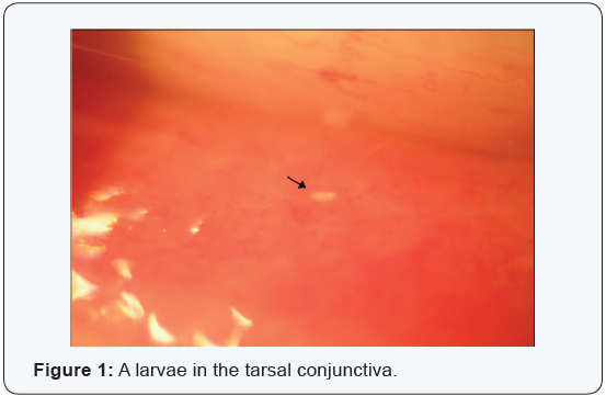 Ophthalmomyiasis is an infection of the eye by Diptera larvae. Oestrus Ovis is the most frequent cause of ocular myiasis especially in countries with tropical or mild climates [1]. The presence of this pathogen is widely seen in Central and Southern Italy and the islands where sheep farming is common [2]. Ophthalmomyiasis, based on its location, is classified as external, internal and/ or orbital. In its external form the larvae are found on the conjunctiva or on the edge of the eyelid [3]. With accidental contact this can give rise to inflammation of the conjunctiva. The patient may also experience lacrimation, photophobia and foreign body sensation in the eye.